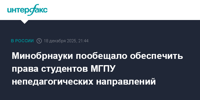 Москва. 18 декабря. INTERFAX.RU - Минобрнауки РФ находится на связи с московским правительством и руководством Московского городского педагогического университета (МГПУ) в связи с сообщением о закрытии в вузе с 1 сентября 2026 года непедагогических специальностей, обещает обеспечить надлежащим образом законные права студентов, сообщили "Интерфаксу" в пресс-службе министерства.