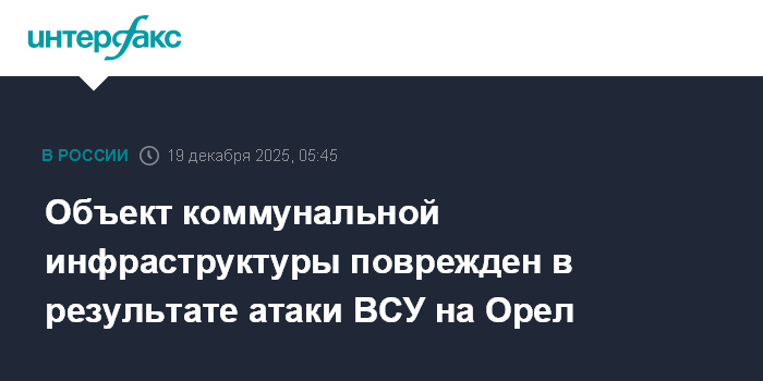 Москва. 19 декабря. INTERFAX.RU - Глава Орловской области Андрей Клычков сообщил, что в результате украинской атаки на Орел поврежден объект коммунальной инфраструктуры.