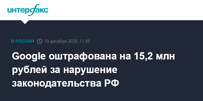 Google оштрафована на 15,2 млн рублей за нарушение законодательства РФ