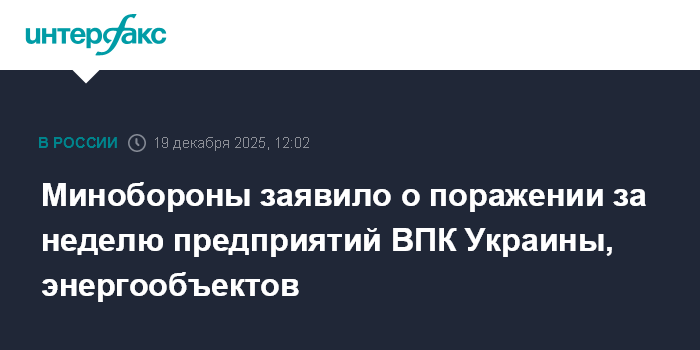 Москва. 19 декабря. INTERFAX.RU - Российские военные сообщили, что за неделю нанесены массированный и шесть групповых ударов, в том числе гиперзвуковым комплексом "Кинжал", по предприятиям военной промышленности Украины, объектам энергетического комплекса, транспортной и портовой инфраструктуре, используемой в интересах ВСУ.