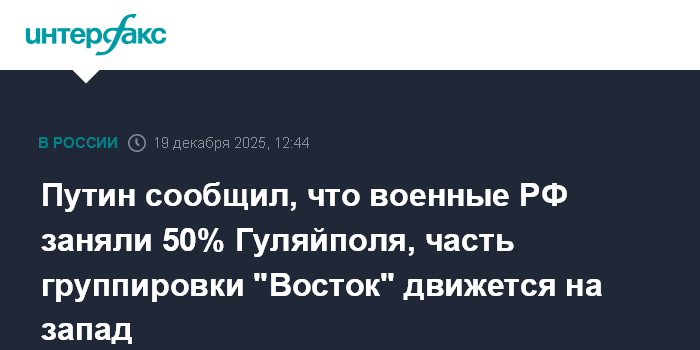 Москва. 19 декабря. INTERFAX.RU - Российские военнослужащие заняли 50% города Гуляйполе, часть группировки "Восток" продолжает движение на запад, сообщил президент РФ Владимир Путин.