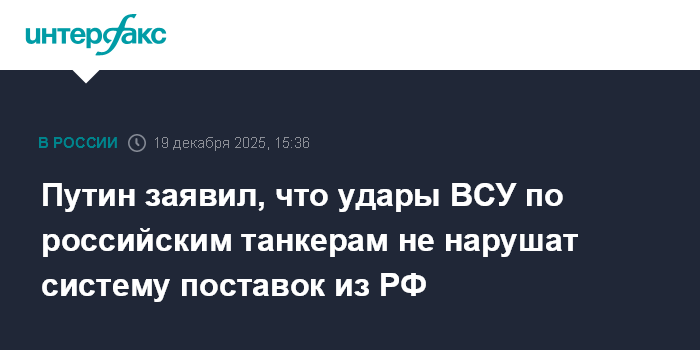 Москва. 19 декабря. INTERFAX.RU - Атаки украинских беспилотников по российским танкерам не нарушат систему поставок из России, заявил президент РФ Владимир Путин.