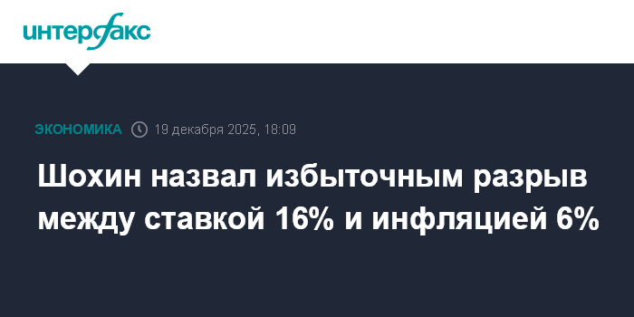 Шохин назвал избыточным разрыв между ставкой 16% и инфляцией 6%