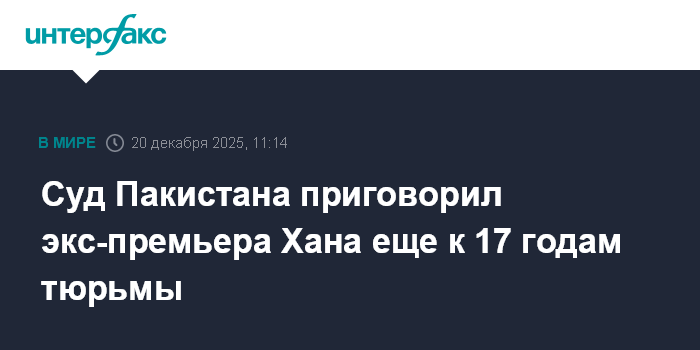 Москва. 20 декабря. INTERFAX.RU - Суд Пакистана приговорил экс-премьера, основателя партии "Движение за справедливость" Имрана Хана, уже находящегося в заключении, еще к 17 годам тюрьмы по делу о коррупции, сообщает в субботу издание Dawn.