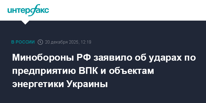 Москва. 20 декабря. INTERFAX.RU - Российские военные заявили, что за сутки нанесены удары по предприятию военной промышленности Украины, объектам энергетики, транспортной и складской инфраструктуры, используемым в интересах ВСУ, и колоннам военной техники.