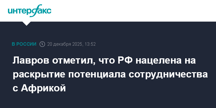 Москва. 20 декабря. INTERFAX.RU - Россия настроена на дальнейшее раскрытие потенциала практического сотрудничества со странами Африки, заявил министр иностранных дел РФ Сергей Лавров.