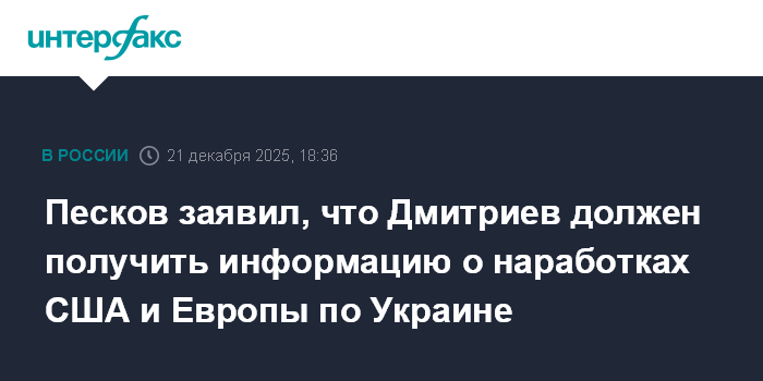 Москва. 21 декабря. INTERFAX.RU - Спецпосланник президента РФ, глава РФПИ Кирилл Дмитриев поехал в США, чтобы узнать о наработках европейцев и американцев по мирному плану по Украине и донести эту информацию до Кремля, сообщил пресс-секретарь главы российского государства Дмитрий Песков.