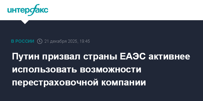 Москва. 21 декабря. INTERFAX.RU - Странам Евразийского экономического союза (ЕАЭС) надо активнее задействовать возможности Евразийской перестраховочной компании, считает президент РФ Владимир Путин. Об этом он заявил, выступая на расширенном заседании Высшего Евразийского экономического совета.