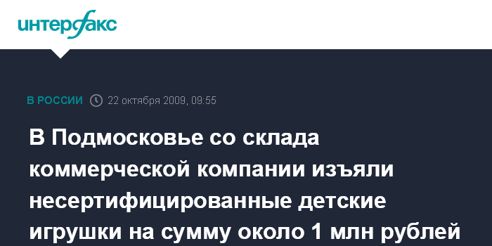 Москва. 22 октября. INTERFAX.RU - В подмосковных Люберцах в среду днем сотрудники областного ГУВД изъяли со склада коммерческой компании детские игрушки из Польши и Китая на сумму 1 млн рублей, сообщил "Интерфаксу" источник в правоохранительных органах региона.