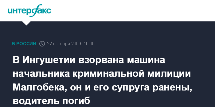 Москва. 22 октября. INTERFAX.RU - В Малгобеке взорвана автомашина начальника криминальной милиции города Исы Коригова.