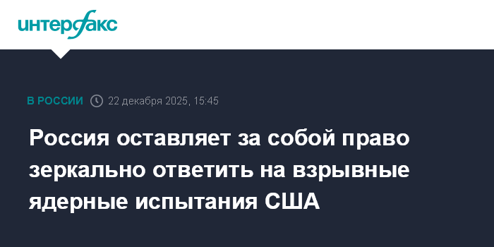 Москва. 22 декабря. INTERFAX.RU - Россия оставляет за собой право зеркального реагирования на возможные полноценные ядерные испытания США, заявил, выступая в международном дискуссионном клубе "Валдай", заместитель министра иностранных дел Сергей Рябков.
