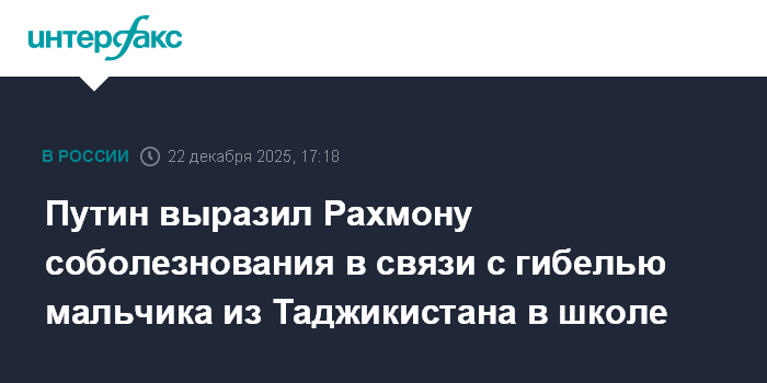 Москва. 22 декабря. INTERFAX.RU - Президент РФ Владимир Путин выразил президенту Таджикистана Эмомали Рахмону соболезнования в связи с гибелью в подмосковной школе мальчика из этой страны. Российский лидер пообещал, что виновные будут наказаны.