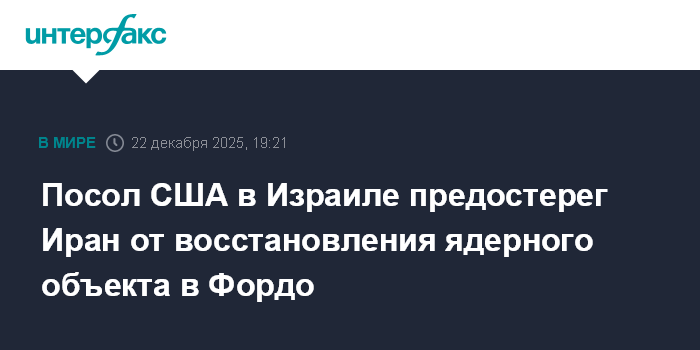 Москва. 22 декабря. INTERFAX.RU - Посол США в Израиле Майк Хакаби заявил, что Иран не извлек выводов из ударов США по ядерным объектам страны, поскольку Тегеран, вероятно, пытается восстановить предприятие в Фордо.