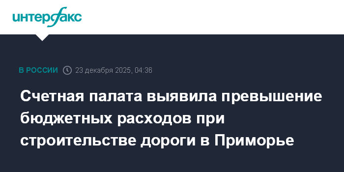 Москва. 23 декабря. INTERFAX.RU - Необоснованные затраты федерального бюджета в размере около 2 млрд рублей выявлены Счетной палатой (СП) по итогам проверки бюджетных средств при строительстве автомобильной дороги Владивосток - Находка - порт Восточный в Приморском крае.