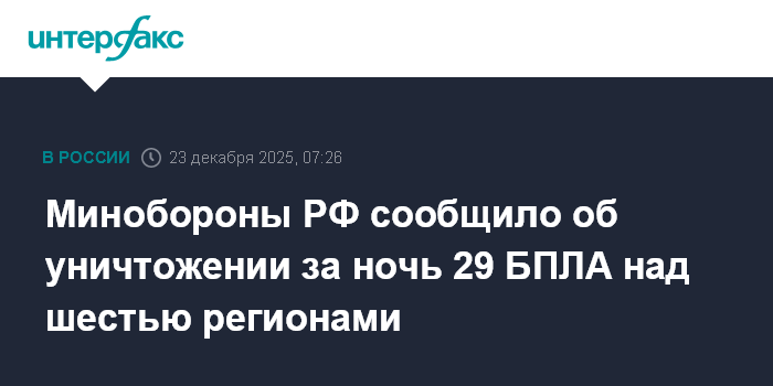 Москва. 23 декабря. INTERFAX.RU - Министерство обороны РФ заявило, что с 23:00 понедельника до 07:00 вторника перехвачены и уничтожены 29 украинских беспилотников над российскими регионами.