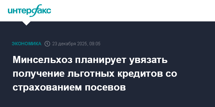 Москва. 23 декабря. INTERFAX.RU - Минсельхоз РФ планирует увязать предоставление аграриям льготных кредитов на сезонные полевые работы со страхованием посевов, сообщила первый замминистра сельского хозяйства Елена Фастова.