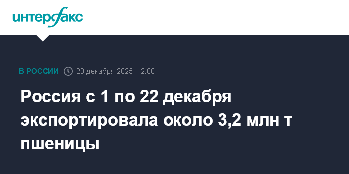 Москва. 23 декабря. INTERFAX.RU - РФ с 1 по 22 декабря отгрузила на экспорт около 3,2 млн тонн пшеницы, сообщили "Интерфаксу" в аналитическом центре "Русагротранса".