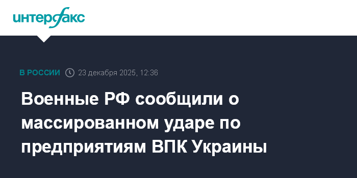 Москва. 23 декабря. INTERFAX.RU - Вооружённые силы России утром во вторник нанесли массированный удар по предприятиям военно-промышленного комплекса Украины и связанным с ними объектам энергетики, сообщает министерство обороны РФ.