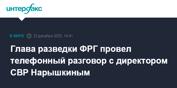 Москва. 23 декабря. INTERFAX.RU - Новый глава Федеральной разведывательной службы Германии Мартин Егер провел телефонный разговор с директором Службы внешней разведки России Сергеем Нарышкиным, сообщает портал WDR Investigativ.