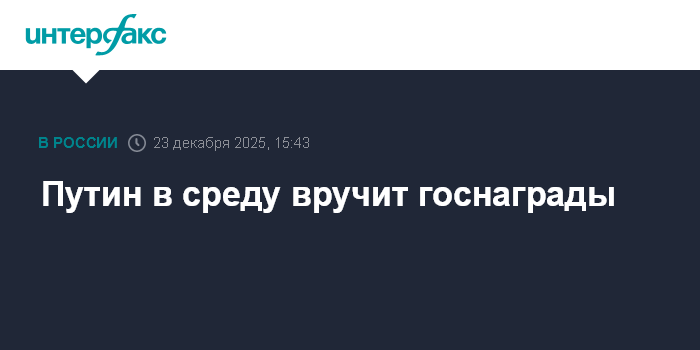 Москва. 23 декабря. INTERFAX.RU - Президент РФ Владимир Путин в среду, 24 декабря, в Екатерининском зале Кремля вручит государственные награды, сообщает пресс-служба Кремля.
