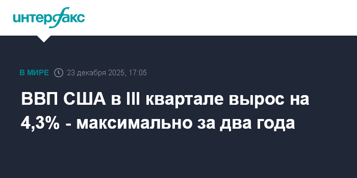 Москва. 23 декабря. INTERFAX.RU - Экономика США в третьем квартале 2025 года увеличилась на 4,3% в пересчете на годовые темпы, сообщило Минторговли страны.