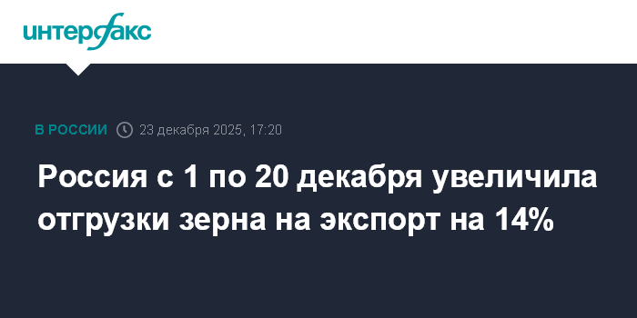 Россия с 1 по 20 декабря увеличила отгрузки зерна на экспорт на 14%
