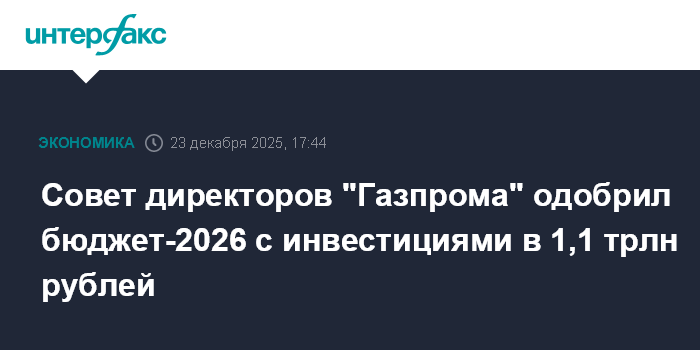 Совет директоров "Газпрома" одобрил бюджет-2026 с инвестициями в 1,1 трлн рублей