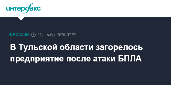 Москва. 24 декабря. INTERFAX.RU - Губернатор Тульской области Дмитрий Миляев сообщил о пожаре на одном из предприятий региона в результате атаки беспилотников.