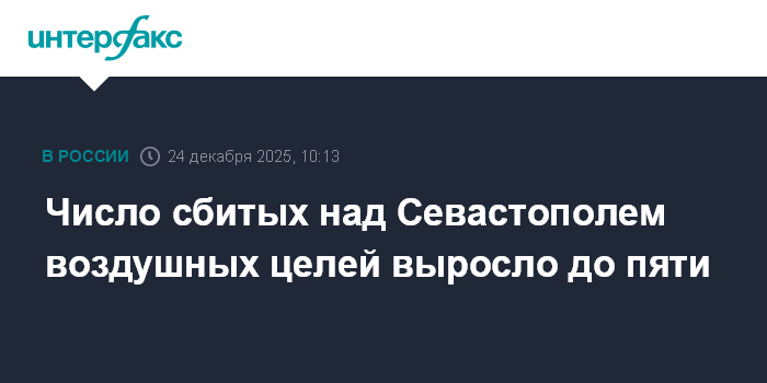 Москва. 24 декабря. INTERFAX.RU - Над Севастополем ПВО продолжает отрожать воздушную атаку, число сбитых воздушных целей выросло до пяти, сообщил губернатор города Михаил Развожаев.