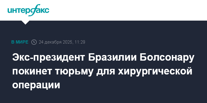 Москва. 24 декабря. INTERFAX.RU - Экс-президент Бразилии Жаир Болсонару, отбывающий 27-летний тюремный срок, с разрешения Верховного суда на этой неделе временно покинет тюрьму для операции по удалению паховой грыжи, сообщают местные СМИ.