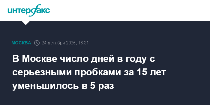 Москва. 24 декабря. INTERFAX.RU - Количество дней, когда москвичи отмечают серьезные проблемы на дорогах и пробки от 8 баллов и выше, уменьшилось с 2010 года в пять раз, сообщил в Мосгордуме мэр столицы Сергей Собянин.