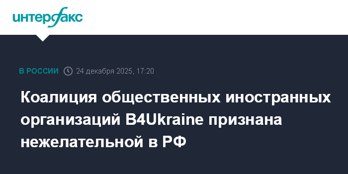 Москва. 24 декабря. INTERFAX.RU - Коалиция общественных иностранных организаций B4Ukraine признана нежелательной в России, сообщила Генпрокуратура РФ в среду.
