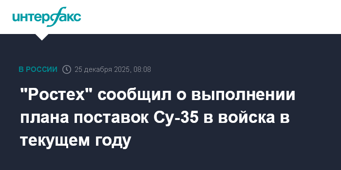 Москва. 25 декабря. INTERFAX.RU - Объединенная авиастроительная корпорация (ОАК) изготовила и передала Минобороны РФ очередные партии истребителей Су-35, план производства на 2025 год выполнен в полном объеме, сообщил "Ростех".