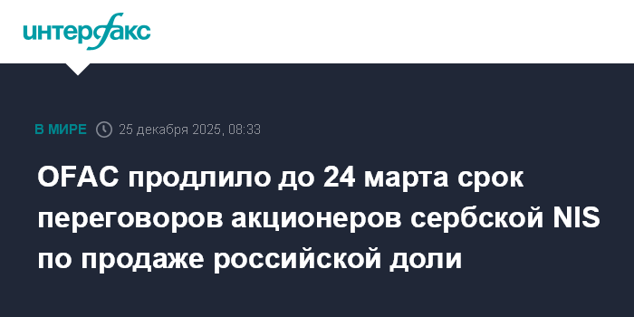 Москва. 25 декабря. INTERFAX.RU - OFAC (Office of Foreign Assets Control, подразделение Минфина США, отвечающее за правоприменение в области санкций) выдало сербской энергокомпании NIS (входит в "Газпром нефть") новую лицензию, разрешающую переговоры акционеров и других заинтересованных сторон об изменении структуры собственности. Новая лицензия предполагает разрешение таких переговоров до 24 марта (прежняя лицензия ограничивала срок переговоров 13 февраля 2026 года), сообщает сербский портал РТС.