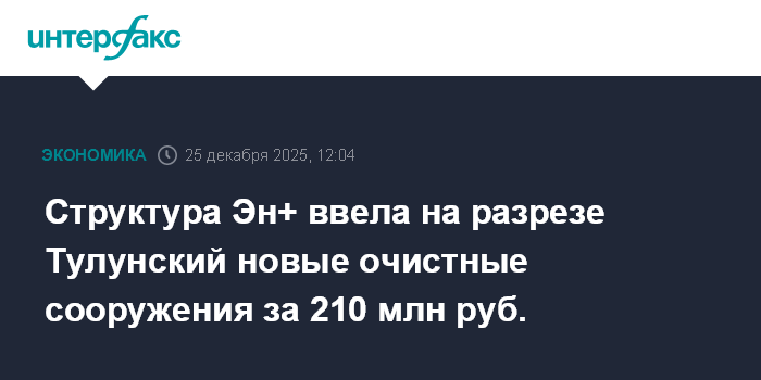 Москва. 25 декабря. INTERFAX.RU - ООО "Эн+ Уголь" (входит в "Эн+") ввело в эксплуатацию очистные сооружения на производственном участке разреза "Тулунский" в Иркутской области, сообщает пресс-служба компании.