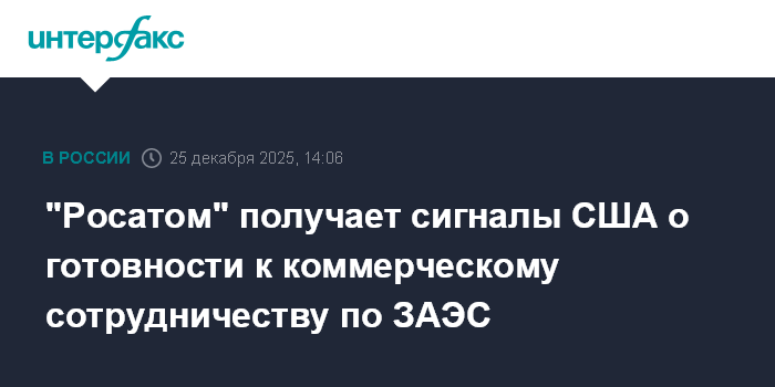 Москва. 25 декабря. INTERFAX.RU - "Росатом" получает сигналы о готовности США к сотрудничеству в плане коммерческого использования энергии, которую генерирует Запорожская атомная электростанция, сказал журналистам гендиректорв госкорпорации Алексей Лихачев.