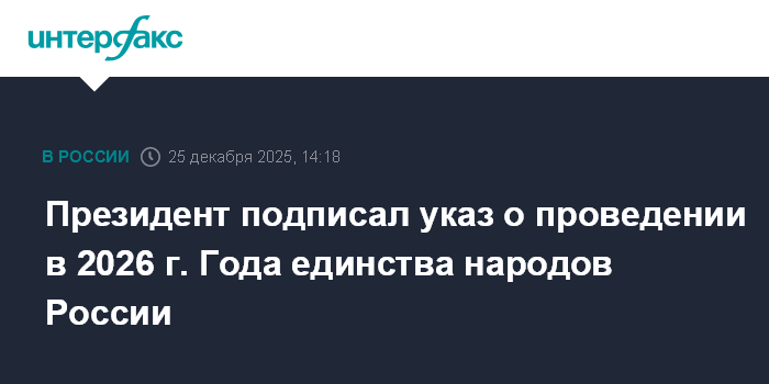 Москва. 25 декабря. INTERFAX.RU - Президент РФ Владимир Путин сообщил, что подписал указ об объявлении 2026 года Годом единства народов России.