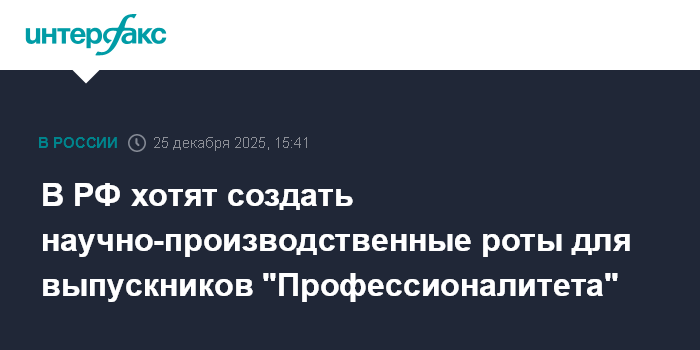 Москва. 25 декабря. INTERFAX.RU - В России прорабатывается вопрос о создании специальных научно-производственных рот для тех, кто выпускается из колледжей по федеральной программе "Профессионалитет", сообщил вице-премьер РФ Дмитрий Чернышенко.