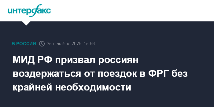 Москва. 25 декабря. INTERFAX.RU - МИД РФ призывает российских граждан воздержаться от посещения Германии без острой необходимости, заявила официальный представитель внешнеполитического ведомства Мария Захарова.