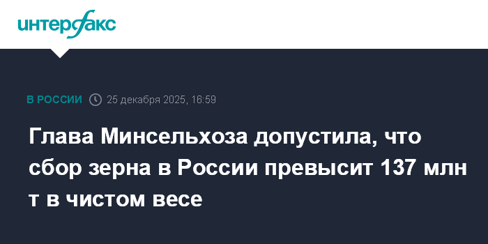Москва. 25 декабря. INTERFAX.RU - Сбор зерна в России в чистом весе в 2025 году может превысить прежний прогноз в 137 млн тонн, считает министр сельского хозяйства Оксана Лут.