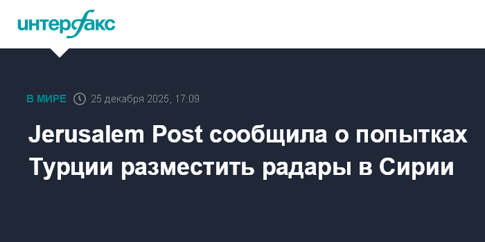 Москва. 25 декабря. INTERFAX.RU - Турция в последние недели попыталась развернуть радары на территории Сирии, пишет The Jerusalem Post со ссылкой на два источника в западных разведках. Это происходит на фоне усиления конфронтации Турции и Израиля по поводу турецкого военного присутствия в Сирии.
