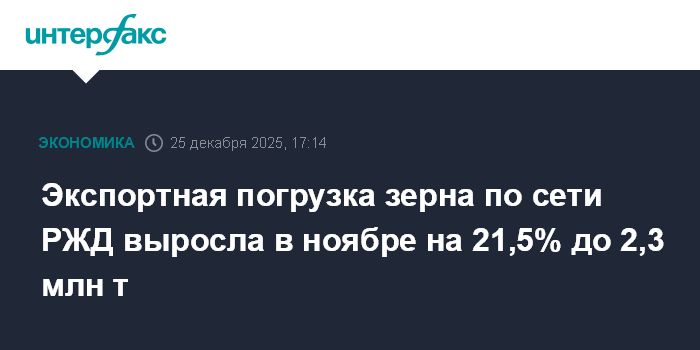 Москва. 25 декабря. INTERFAX.RU - Погрузка зерна на экспорт по сети ОАО "РЖД" выросла в ноябре 2025 года на 21,5% по сравнению с прошлогодним показателем и составила 2,3 млн тонн, сообщила компания.