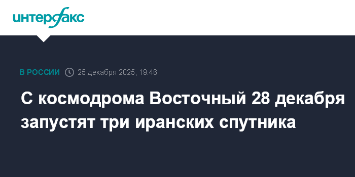 Москва. 25 декабря. INTERFAX.RU - Иран планирует 28 декабря вывести на орбиту три спутника с космодрома Восточный при помощи российской ракеты-носителя "Союз", сообщает агентство ISNA со ссылкой на главу Иранского космического агентства Хасана Саларие.