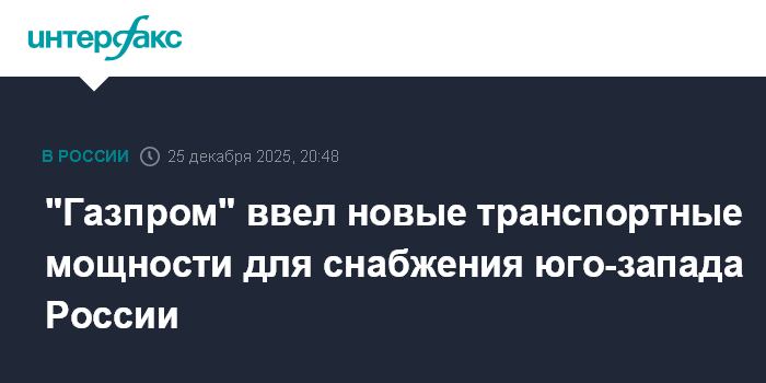Москва. 25 декабря. INTERFAX.RU - "Газпром" ввел новые транспортные мощности для снабжения газом юго-запада России, сообщил на совещании о предварительных итогах года председатель правления компании Алексей Миллер.