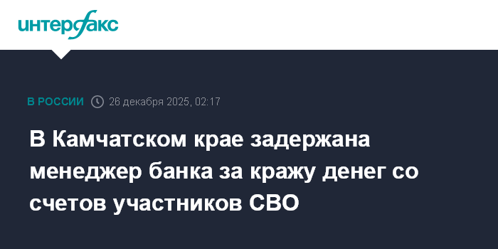 Москва. 26 декабря. INTERFAX.RU - В Камчатском крае задержали менеджера банка по уголовному делу о краже денег со счетов клиентов более чем на 3,3 млн рублей, большинство потерпевших - участники СВО, сообщает в пятницу пресс-служба управления ФСБ России по региону.
