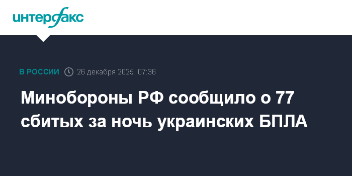 Москва. 26 декабря. INTERFAX.RU - Минобороны РФ сообщило о перехвате и уничтожении в ночь на пятницу 77 украинских БПЛА над российскими регионами.