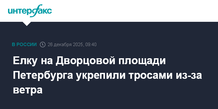 Москва. 26 декабря. INTERFAX.RU - Дополнительную страховочную систему установили в Петербурге для главной городской ели на Дворцовой площади, сообщил вице-губернатор Борис Пиотровский.