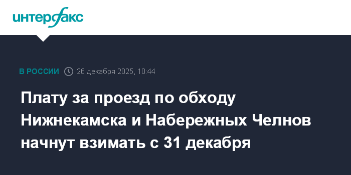 Москва. 26 декабря. INTERFAX.RU - Автодорожный обход Нижнекамска и Набережных Челнов, переданный в доверительное управление "Автодора", станет платным в ночь с 30 на 31 декабря, сообщила пресс-служба госкомпании.