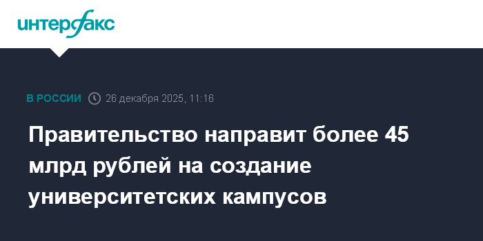 Москва. 26 декабря. INTERFAX.RU - Премьер-министр Михаил Мишустин подписал распоряжение о распределении в 2026-2028 годах более 45 млрд рублей на создание современных университетских кампусов в нескольких российских регионах, сообщает сайт правительства.