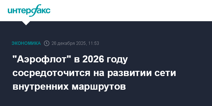 Москва. 26 декабря. INTERFAX.RU - "Аэрофлот" в 2026 году планирует сфокусироваться на развитии маршрутной сети внутри России, сообщил "России 24" гендиректор компании Сергей Александровский.